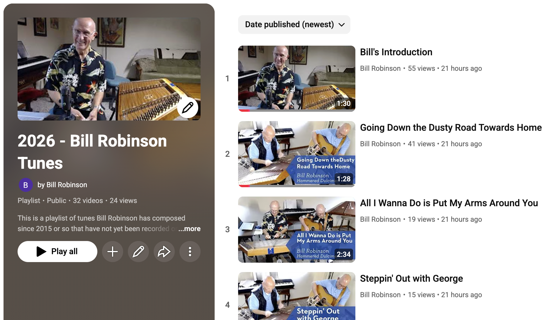 Bill Robinson is a 3rd generation hammered dulcimer player living in St. Charles, Illinois. Known for his upbeat playing style, and unique dulcimer traditions handed down from generation to generation, Robinson is a master of the instrument..